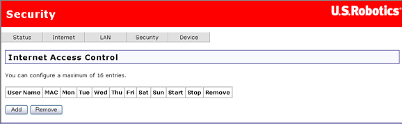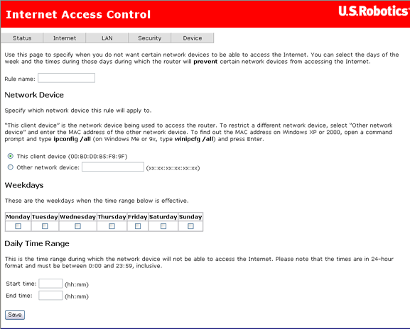 Cliquez sur Add (Ajouter) pour définir un filtre d'accès à Internet, puis entrez ses paramètres dans la page suivante. Pour chaque règle, vous devez définir un nom, spécifier l'adresse MAC de l'ordinateur à bloquer, la durée et les jours pendant lesquels il sera bloqué.