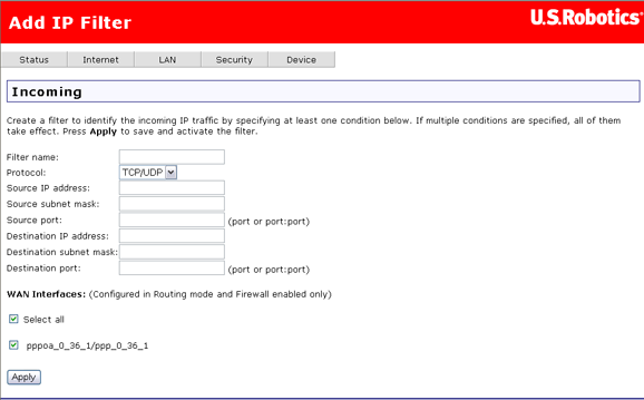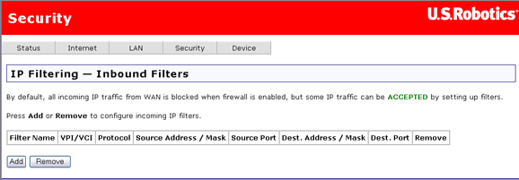 Cliquez sur Add (Ajouter) pour créer un filtre entrant.