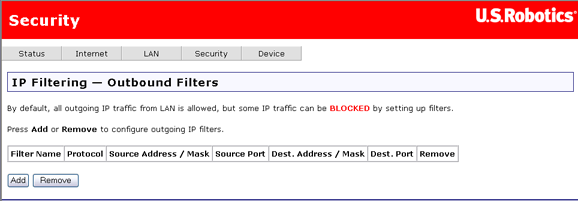 Pour supprimer la définition d'un filtre du tableau des filtres sortants (première page ci-dessus), cochez la case Remove (Supprimer) correspondant au filtre et cliquez sur le bouton Remove (Supprimer).