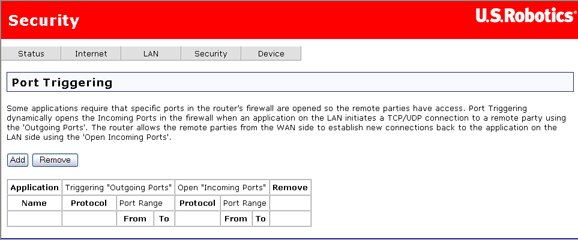 Le déclenchement des ports est similaire à un serveur virtuel (virtual server), à la différence qu'il crée un trou dynamique ou temporaire dans le pare-feu afin que des systèmes extérieurs puissent accéder aux ressources locales. Le déclenchement des ports est plus sécurisé qu'un serveur virtuel, mais il ne prend pas en charge l'utilisation simultanée des mêmes ports par plusieurs systèmes. Un exemple de déclenchement des ports serait une application sur le réseau local qui active une connexion vers un serveur distant via des ports distants. Le serveur externe peut ensuite se connecter à cette application par le biais des ports entrants.