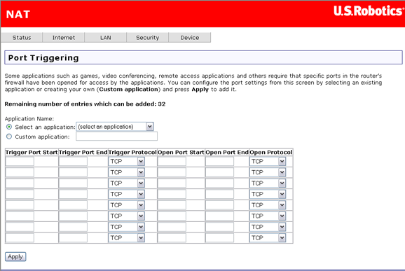 Cliquez sur Add (Ajouter) pour définir le déclenchement des ports pour une application Internet. Dans la page ci-dessous, sélectionnez le nom de l'application ; les paramètres correspondants sont automatiquement définis (tableau ci-après). Si l'application que vous souhaitez ne fait pas partie de la liste, sélectionnez Custom application (Application personnalisée) et définissez les paramètres correspondants dans le tableau ci-dessous. (Voir la documentation de l'application pour connaître les paramètres appropriés.) Cliquez sur Apply (Appliquer) pour enregistrer le déclenchement des ports.