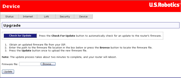 Újabb készülékszoftver-verzió meglétét ellenőrizheti a U.S. Robotics weblapján (a Check for Update (frissítés keresése) gombra kattintva), vagy forduljon internetszolgáltatójához. Miután az új készülékszoftver-fájlt elmentette a számítógép merevlemezére, kattintson a Browse (keresés) gombra a fájl megkereséséhez, majd az Update (frissítés) gombra a frissítés végrehajtásához. A folyamat kb. két percig tart. Az alábbihoz hasonló állapotsort lát majd. Frissítés közben ne kapcsolja ki az útválasztót, és ne húzzon ki semmilyen kábelt.