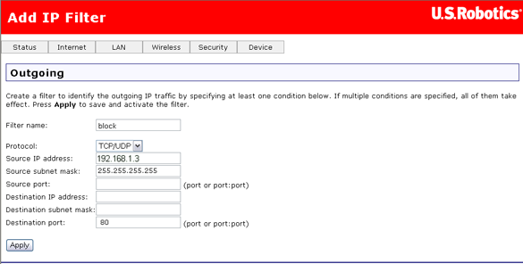Parabéns! O filtro de endereços de saída está concluído. O computador com o endereço IP introduzido em Address Filter (Filtro do endereço) não poderá aceder à porta da Internet do router.