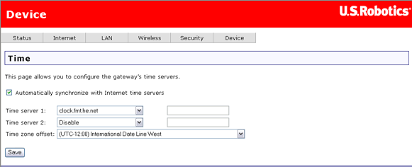 K synchronizaci s časovým serverem v síti Internet určete jeden nebo dva servery tak, že je vyberete ze seznamu nebo zadáte jejich adresy IP. Potom zvolte své časové pásmo v položce Time zone offset [Odchylka časového pásma] a klepněte na tlačítko Save [Uložit].