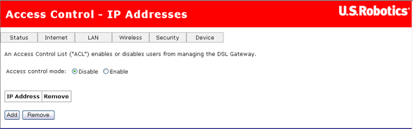 På den här sidan kan du kontrollera åtkomst till gatewayens webbanvändargränssnitt för enhetshantering. Du kan aktivera eller avaktivera åtkomsten till de här funktionerna för IP-adresser på det lokala nätverket. Om du vill lägga till en IP-adress i listan klickar du på Add (lägg till). Om du vill ta bort en IP-adress från listan markerar du tillhörande kryssruta i kolumnen Remove (ta bort) och klickar på knappen Remove (ta bort).