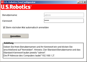 Klicken Sie zum Einrichten der Wireless-Kommunikation oben auf dem EasyConfigurator-Bildschirm auf die Option Status (sofern dieser Bildschirm nicht bereits geöffnet ist). Klicken Sie dann auf Configure Wireless (Wireless-Konfig.). Melden Sie sich an, wenn Sie von der Software dazu aufgefordert werden (verwenden Sie als Benutzernamen und Kennwort admin). In Ihrem Webbrowser wird nun eine Seite geöffnet, auf der Sie die Sicherheit Ihres Wireless-Netzwerks konfigurieren können. U.S. Robotics empfiehlt nachdrücklich, das Netzwerk gemäß den Anleitungen auf dieser Seite zu sichern.