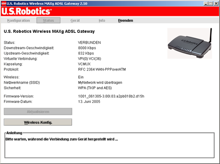 Das System versucht zu diesem Zeitpunkt, eine Verbindung zum Internet herzustellen. Dies kann einige Minuten dauern. Anschließend wird die folgende Statusseite angezeigt.