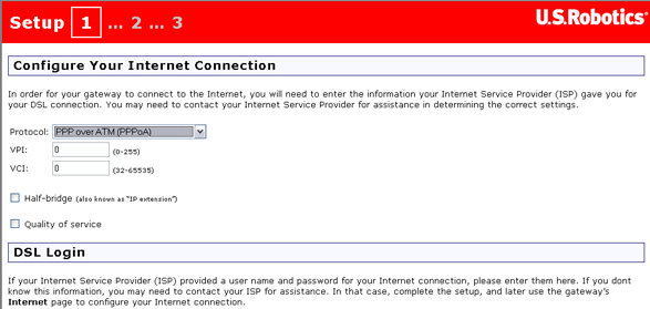 Auf dieser Seite können Sie die Internetverbindung des Gateways einrichten. Die wichtigsten Einstellungen sind das Verbindungsprotokoll, VPI/VCI-Werte und verschiedene Parameter, die spezifisch für das Verbindungsprotokoll sind, wie z. B. Anmeldebenutzername und -kennwort. Ihr Internet Service Provider sollte Ihnen die meisten dieser Informationen zur Verfügung gestellt haben.