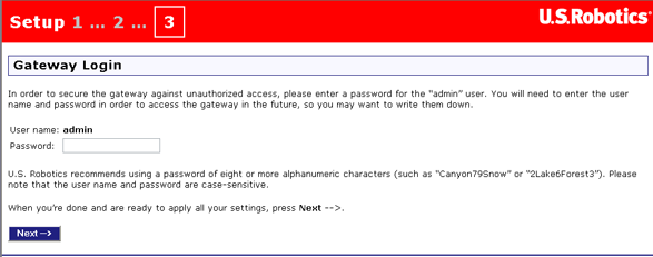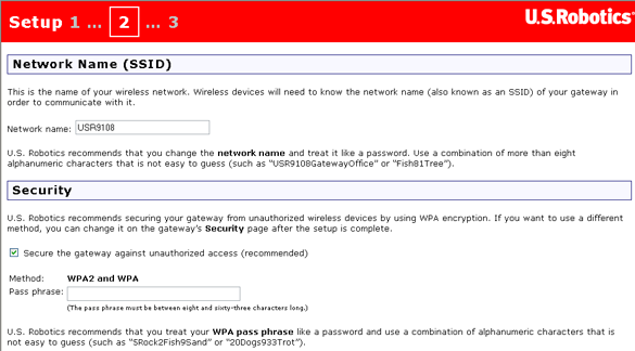 U.S. Robotics empfiehlt, das Kontrollkästchen Secure the gateway... (Gateway schützen gegen ...) zu aktivieren. Wenn Sie die Sicherheit des Gateways weiter konfigurieren möchten, müssen Sie im Feld "Pass phrase" (Kennwort) einen Text eingeben. Dieser Text gleicht einem Kennwort. Wählen Sie daher einen Text, der für Unbefugte nicht einfach zu erraten ist, den Sie sich jedoch gut merken können. Klicken Sie hier, um weitere Informationen zur drahtlosen Sicherheit zu erhalten.