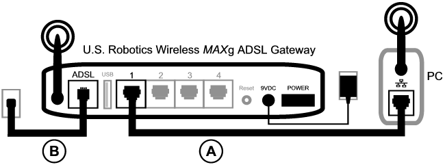 HINWEIS: Der Vollständigkeit halber werden in der folgenden Abbildung sowohl Kabel- als auch Wireless-Verbindungen zwischen dem Computer und dem U.S. Robotics Wireless MAXg ADSL Gateway dargestellt. Normalerweise verwenden Computer jedoch nur einen der beiden Verbindungstypen.