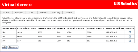 Wählen Sie im Menü Security (Sicherheit) den Befehl Virtual Servers (Virtuelle Server). Die folgende Seite wird angezeigt.