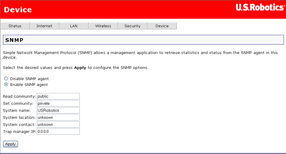 SNMP (Simple Network Management Protocol) ist ein Protokoll, mit dem Sie das lokale Netzwerk der am Gateway angeschlossenen Systeme überwachen und verwalten können. In SNMP erfasst ein Gerät mit der Bezeichnung SNMP-Agent Statistiken über die Netzwerkleistung und sendet dann die statistischen Daten an einen anderen Computer zur Speicherung und Analyse. Auf dieser Seite können Sie das Gateway als SNMP-Agenten konfigurieren.