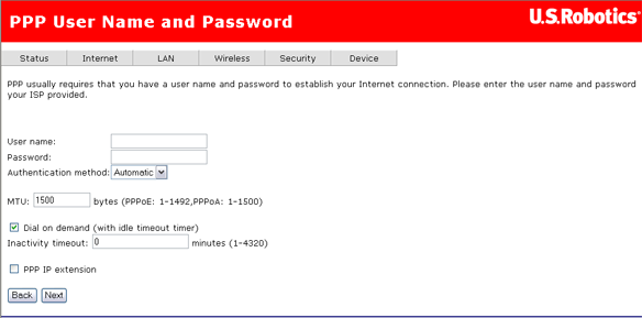 Authentication method (Authentifizierungsmethode) ist standardmäßig auf Automatic (Automatisch) eingestellt. Wir empfehlen Ihnen, Authentication method auf Automatic gesetzt zu lassen. Bei Bedarf können Sie aber auch PAP oder CHAP auswählen. Der Standardwert für "MTU" (Maximum Transmission Unit, Größtmögliche Datenübertragungsmenge) lautet 1500 für PPPoA und 1492 für PPPoE. Ändern Sie diese Werte nur, wenn Sie von Ihrem ISP dazu aufgefordert werden.