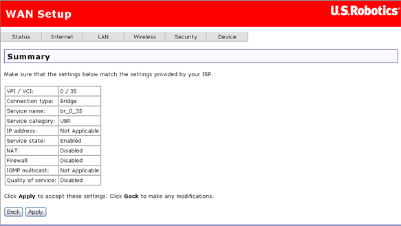 Auf der Übersichtsseite ist die gesamte Konfiguration zusammengefasst. Beenden Sie die Konfiguration mit Apply (Übernehmen). Dieser Vorgang nimmt etwa eine Minute in Anspruch. Oder klicken Sie auf Back (Zurück), wenn die Einstellungen noch geändert werden sollen.