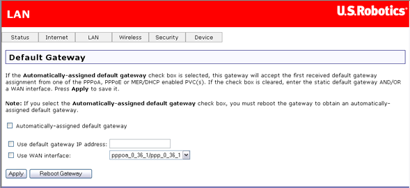 Wenn die IP-Adresse des ISP-Gateways automatisch abgerufen werden soll, aktivieren Sie Automatically-assigned default gateway (Automatisch zugewiesenes Standard-Gateway). Dadurch werden die benutzerdefinierten Felder ausgeblendet. Wenn Sie Automatically-assigned default gateway (Automatisch zugewiesenes Standard-Gateway) aktivieren, wird die Änderung erst wirksam, wenn Sie das Gerät neu starten. Klicken Sie dazu auf Apply (Übernehmen) und dann auf Reboot Gateway (Gateway neu starten) klicken.