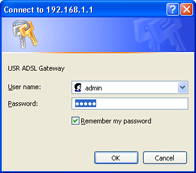 Wenn die Felder "User name" (Benutzername) und "Password" (Kennwort) noch nicht ausgefüllt sind und Sie die Kontokennwörter nicht geändert haben, geben Sie admin und admin ein. (Wenn Sie das Kennwort für das Konto admin geändert haben, geben Sie dieses Kennwort ein.) Klicken Sie anschließend auf OK.