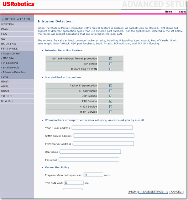 В разделе Intrusion Detection (Обнаружение вторжения) выберите параметр SPI and Anti-DoS firewall protection (Статистика (SPI) и защита брандмауэра против атак с целью отключения).