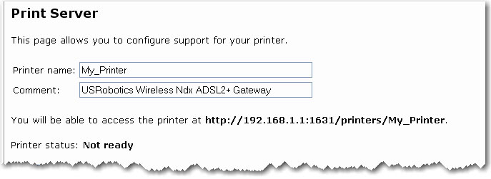 Auf dieser Seite werden der Name des Gateways für den Drucker sowie alle weiteren Informationen angezeigt, die Sie dazu gespeichert haben. Unter Comment (Anmerkungen) können Sie die Marke und das Modell des Druckers eingeben. Die unter dem Feld Comment angezeigte URL verwenden Sie zum Konfigurieren der Druckerfreigabe.