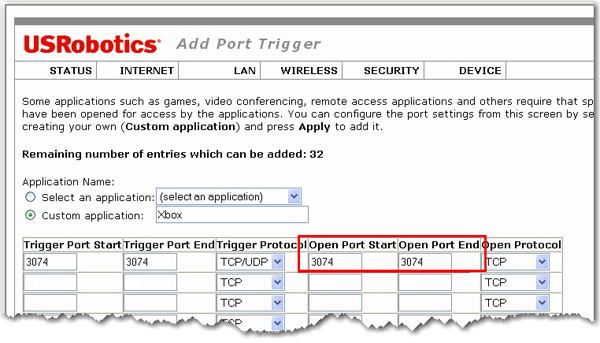 Geben Sie unter Trigger Port Start (Auslösender Anschluss Start) und Trigger Port End (Auslösender Anschluss Ende) jeweils den Wert 3074 ein.