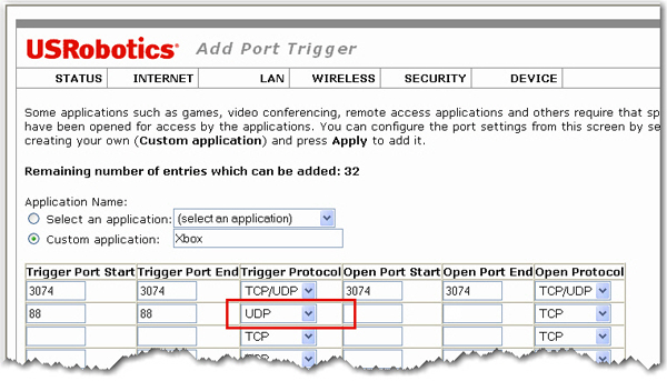 Im folgenden Beispiel wird die Konfiguration Ihres Routers für den Anschluss einer Xbox® beschrieben. Eine vollständige Liste von Anwendungen und Anschlüssen finden Sie auf der Website www.iana.org. Auf dieser Seite wird außerdem erläutert, wie Sie Ihre eigene Regel für die Anschlussweiterleitung für die PlayStation2™ erstellen können.