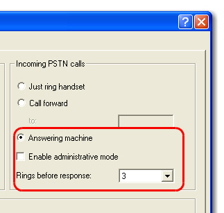 Selecteer Answering machine (Antwoordapparaat) onder Incoming PSTN calls (Inkomende PSTN-gesprekken) om het antwoordapparaat (voicemail) voor inkomende PSTN-gesprekken te activeren. Selecteer bij Rings before response (Aantal keer overgaan voor actie) het aantal keer dat de telefoon moet overgaan voordat het antwoordapparaat opneemt.