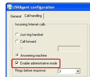 Als u de beheerdersmodus voor inkomende internetgesprekken wilt activeren, dient u eerst te controleren of Call forward (Gesprekken doorschakelen) of Answering machine (Antwoordapparaat) reeds is geselecteerd onder Incoming Internet calls (Inkomende internetgesprekken). Selecteer vervolgensEnable administrative mode (Beheerdersmodus activeren).