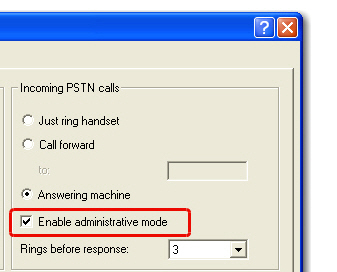 Als u de beheerdersmodus voor inkomende PSTN-gesprekken wilt activeren, dient u eerst te controleren of Call forward (Gesprekken doorschakelen) of Answering machine (Antwoordapparaat) reeds is geselecteerd onder Incoming PSTN calls (Inkomende PSTN-gesprekken). Selecteer vervolgens Enable administrative mode (Beheerdersmodus activeren).