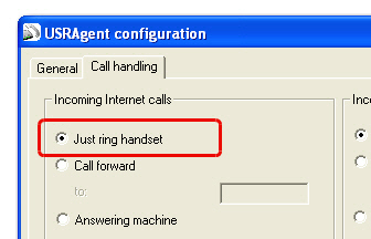 Selecteer Just ring handset (Telefoon laten overgaan) onder Incoming Internet calls (Inkomende internetgesprekken) om gespreksverwerking voor inkomende internetgesprekken uit te schakelen.